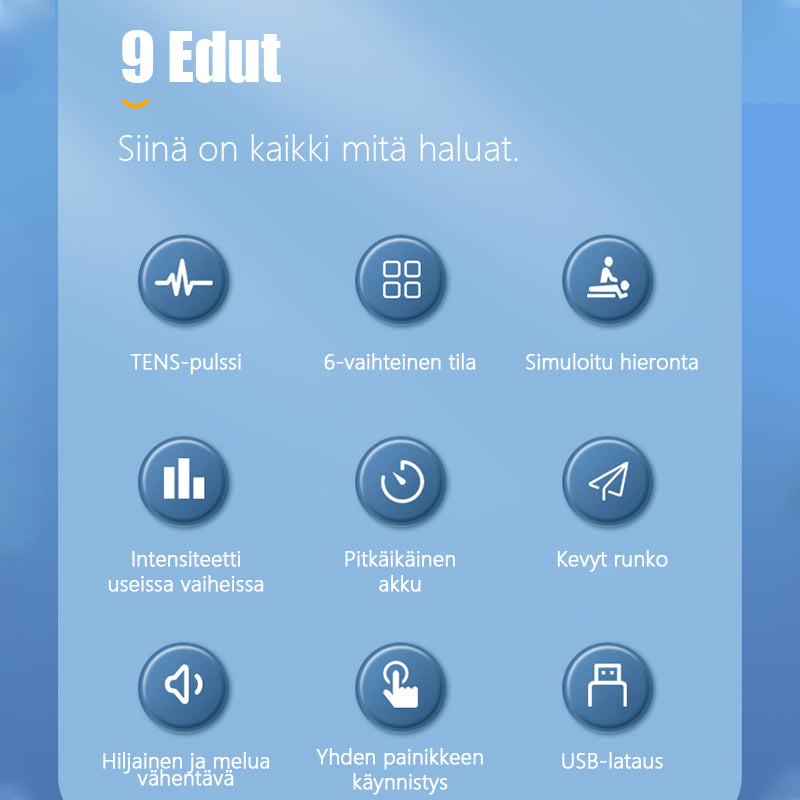 • Useita päivityksiä korkeampiin vaatimuksiin: TENS-pulssi, 6 tilaa, simulaatiohieronta, useita vahvuuksia, pitkä akunkesto, kevyt runko, hiljainen melunvaimennus, yhden painikkeen käynnistys, USB-lataus.