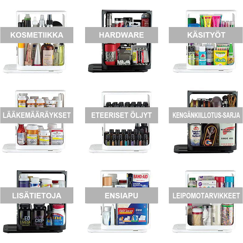 Vedä ja kierrettävä muotoilu pitää tavarasi järjestyksessä. Se pitää keittiön kaapit, vaatekaapit, kylpyhuoneet ja askartelupöydät mahdollisimman puhtaina.