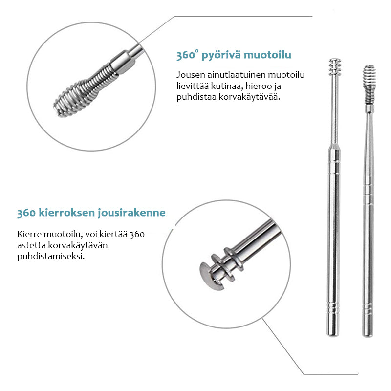 Innovatiivinen jousikuormitettu korvavahan puhdistustyökalusarja