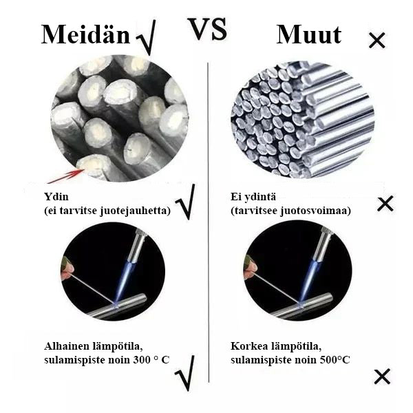 {"id":7513351028820,"title":"Matalalämpötilainen alumiinihitsauslanka","handle":"matalalampotilainen-alumiinihitsauslanka","description":"\u003ch3 style=\"text-align: center;\"\u003e\u003cspan style=\"color: rgb(255, 128, 0);\"\u003eVahvimmat, nopeimmat ja helpoimmin valmistettavat tai korjattavat alumiiniosat – kalliita laitteita ei tarvita.\u003c\/span\u003e\u003c\/h3\u003e\n\u003cp\u003e\u003cimg style=\"display: block; margin-left: auto; margin-right: auto;\" height=\"480\" width=\"480\" src=\"https:\/\/cdn.shopify.com\/s\/files\/1\/0548\/8377\/8692\/files\/1_c4c88853-8fed-4465-9961-8f100b0c02b9.webp?v=1725261766\" alt=\"\" data-mce-src=\"https:\/\/cdn.shopify.com\/s\/files\/1\/0548\/8377\/8692\/files\/1_c4c88853-8fed-4465-9961-8f100b0c02b9.webp?v=1725261766\" data-mce-style=\"display: block; margin-left: auto; margin-right: auto;\"\u003e\u003c\/p\u003e\n\u003cp style=\"text-align: center;\"\u003eMuodostaen vahvan sidoksen pienellä kosketuspinnalla perusmetalliin, se on vahvempaa kuin lievä teräs. Vetolujuus jopa \u003cstrong\u003e45 000 \u003c\/strong\u003epaunaa paksuja tai ohuita osia liitettäessä.\u003c\/p\u003e\n\u003cp\u003e\u003cimg style=\"display: block; margin-left: auto; margin-right: auto;\" height=\"276\" width=\"480\" src=\"https:\/\/cdn.shopify.com\/s\/files\/1\/0548\/8377\/8692\/files\/2_f27b5133-8977-442f-831c-e7d4cc6aac2d.gif?v=1725261768\" alt=\"\" data-mce-src=\"https:\/\/cdn.shopify.com\/s\/files\/1\/0548\/8377\/8692\/files\/2_f27b5133-8977-442f-831c-e7d4cc6aac2d.gif?v=1725261768\" data-mce-style=\"display: block; margin-left: auto; margin-right: auto;\"\u003e\u003c\/p\u003e\n\u003cp\u003e\u003cspan style=\"color: rgb(255, 128, 0);\"\u003e\u003cstrong\u003eTuotteen edut:\u003c\/strong\u003e\u003c\/span\u003e\u003c\/p\u003e\n\u003cul\u003e\n\u003cli\u003eSulattavat hitsaustangot ovat korkealaatuisia erikoishitsaustankoja, joita käytetään pääasiassa alumiinin ja alumiiniseosten hitsaukseen\/juottamiseen. \u003cstrong\u003eNiitä voidaan kuitenkin käyttää myös muiden ei-rautametallien kuin ruostumattoman teräksen juottamiseen.\u003c\/strong\u003e\n\u003c\/li\u003e\n\u003cli\u003eKäyttökohteita ovat lastauslaiturit, lastausrampit, telakat, timanttilaatat, kastelulinjat, moottorilohkot, vaihteistot ja paljon muuta.\u003c\/li\u003e\n\u003c\/ul\u003e\n\u003cp\u003e\u003cimg style=\"display: block; margin-left: auto; margin-right: auto;\" height=\"481\" width=\"481\" src=\"https:\/\/cdn.shopify.com\/s\/files\/1\/0548\/8377\/8692\/files\/3_40fe322d-4740-4b15-a8f3-de64c2bd3f56.gif?v=1725261768\" alt=\"\" data-mce-src=\"https:\/\/cdn.shopify.com\/s\/files\/1\/0548\/8377\/8692\/files\/3_40fe322d-4740-4b15-a8f3-de64c2bd3f56.gif?v=1725261768\" data-mce-style=\"display: block; margin-left: auto; margin-right: auto;\"\u003e\u003c\/p\u003e\n\u003ch3\u003e\u003cspan style=\"color: rgb(255, 128, 0);\"\u003eHitsausohjeet:\u003c\/span\u003e\u003c\/h3\u003e\n\u003cp\u003e\u003cimg style=\"display: block; margin-left: auto; margin-right: auto;\" height=\"481\" width=\"481\" src=\"https:\/\/cdn.shopify.com\/s\/files\/1\/0247\/5143\/9956\/files\/4_0642c8f3-559d-42f5-9969-dc80c32994c6.jpg?v=1725518362\" alt=\"\"\u003e\u003c\/p\u003e\n\u003cp\u003e1. Puhdista hitsattava alue perusteellisesti ja hankaa pohjaa ruostumattomalla teräsharjalla, kunnes pinta on kirkas.\u003c\/p\u003e\n\u003cp\u003e2. Lämmitä sitten hitsattava alue tasaisesti.\u003c\/p\u003e\n\u003cp\u003e3. Kuumennettaessa hiero elektrodia tiukasti lämmitettyä aluetta vasten, kunnes virtaus alkaa.\u003c\/p\u003e\n\u003cp\u003e\u003cimg alt=\"\" src=\"https:\/\/cdn.shopify.com\/s\/files\/1\/0548\/8377\/8692\/files\/5_db5c7a54-bac7-4522-b45f-700f2d199a29.webp?v=1725261767\" width=\"481\" height=\"481\" style=\"display: block; margin-left: auto; margin-right: auto;\"\u003e\u003c\/p\u003e\n\u003cp\u003e\u003cspan style=\"color: rgb(255, 128, 0);\"\u003e\u003cstrong\u003eVAROITUS: \u003c\/strong\u003e\u003c\/span\u003eÄlä koskaan kuumenna alumiinielektrodeja suoraan, sillä ne hilseilevät ja juotos hajoaa helposti, jos sulatat elektrodit suoraan. Muista, että elektrodin väärin sulattaminen suoraan hitsiin voi saada hitsin haurastumaan.\u003c\/p\u003e\n\u003cp\u003e\u003cimg style=\"display: block; margin-left: auto; margin-right: auto;\" height=\"693\" width=\"481\" src=\"https:\/\/cdn.shopify.com\/s\/files\/1\/0247\/5143\/9956\/files\/6_bf41a949-f11b-449d-84b6-5cb3e92183a6.jpg?v=1725518362\" alt=\"\"\u003e\u003c\/p\u003e\n\u003cp\u003e\u003cspan style=\"color: rgb(255, 128, 0);\"\u003e\u003cstrong\u003eNämä ovat vain muutamia niistä monista osista, jotka voidaan korjata helposti!\u003c\/strong\u003e\u003c\/span\u003e\u003c\/p\u003e\n\u003cp\u003e\u003cimg style=\"display: block; margin-left: auto; margin-right: auto;\" height=\"592\" width=\"481\" src=\"https:\/\/cdn.shopify.com\/s\/files\/1\/0247\/5143\/9956\/files\/7_e6a612f2-44c6-4ba6-85ea-09d7907b1c6c.jpg?v=1725518362\" alt=\"\"\u003e\u003c\/p\u003e\n\u003ch3\u003e\u003cspan style=\"color: rgb(255, 42, 0);\"\u003eTekniset tiedot:\u003c\/span\u003e\u003c\/h3\u003e\n\u003cul\u003e\n\u003cli\u003e\n\u003cstrong\u003eMateriaali: \u003c\/strong\u003ealumiini\u003c\/li\u003e\n\u003cli\u003e\n\u003cstrong\u003eSulamislämpötila:\u003c\/strong\u003e 580–620 °C (1076–1148 °F)\u003c\/li\u003e\n\u003cli\u003eEi kaasu- tai toksiinivuotoja, lyijyttömät materiaalit.\u003c\/li\u003e\n\u003cli\u003eErinomainen korroosionkestävyys.\u003c\/li\u003e\n\u003cli\u003eMinimoi raaka-aineiden muodonmuutos hitsauksen aikana.\u003c\/li\u003e\n\u003cli\u003e\n\u003cstrong\u003eMitat: \u003c\/strong\u003e50 cm x 1,6 mm.\u003cbr\u003e\n\u003c\/li\u003e\n\u003c\/ul\u003e\n\u003ch3\u003e\u003cspan style=\"color: rgb(255, 42, 0);\"\u003eTämä paketti sisältää:\u003c\/span\u003e\u003c\/h3\u003e\n\u003cul\u003e\n\u003cli\u003e20 tai 30 hitsauspuikkoa\u003cbr\u003e\n\u003c\/li\u003e\n\u003c\/ul\u003e\n\u003ch3\u003e\u003cspan style=\"color: rgb(255, 42, 0);\"\u003eH